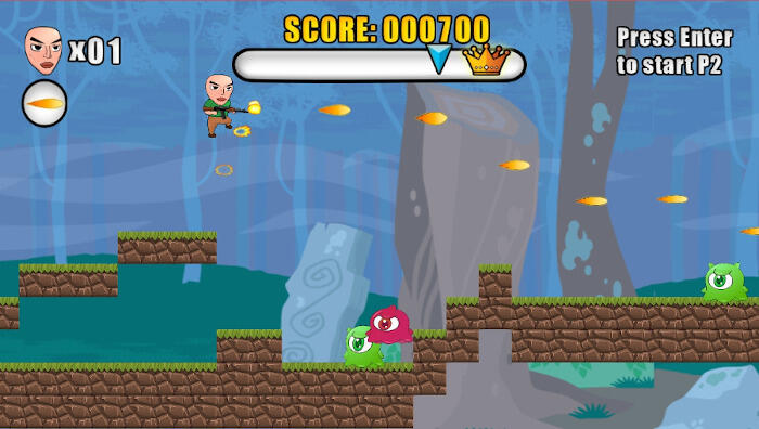 Character movement, shooting, pushing box mechanic, in-game items, weapons pickup, AI behaviors.